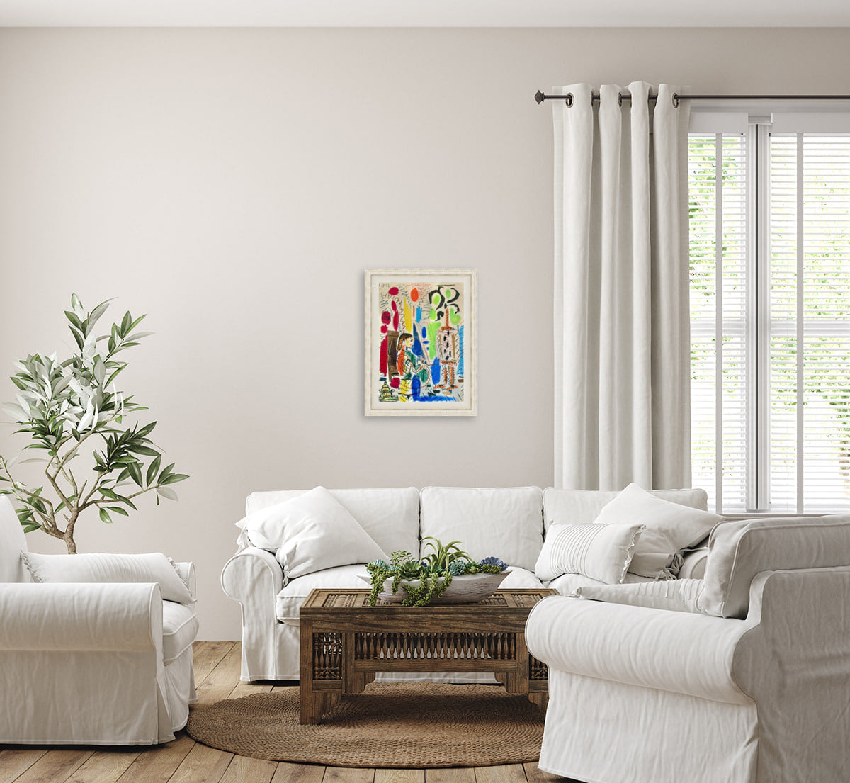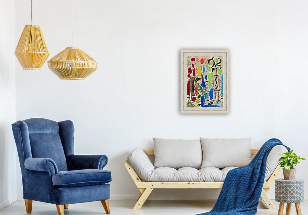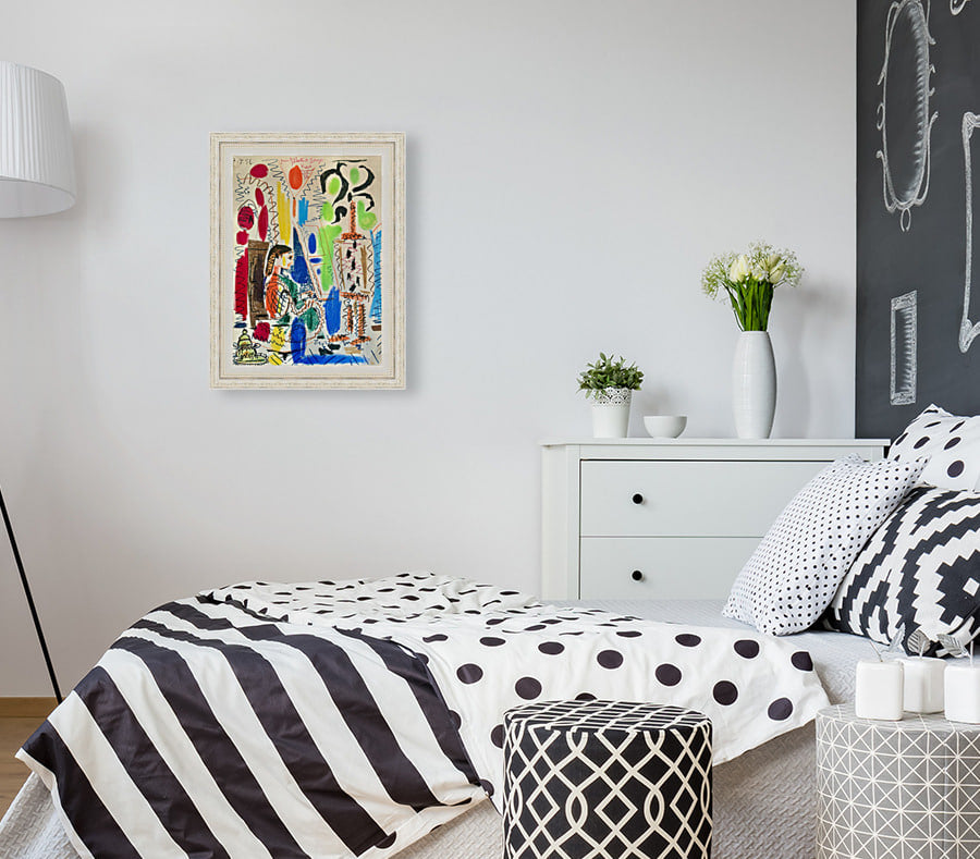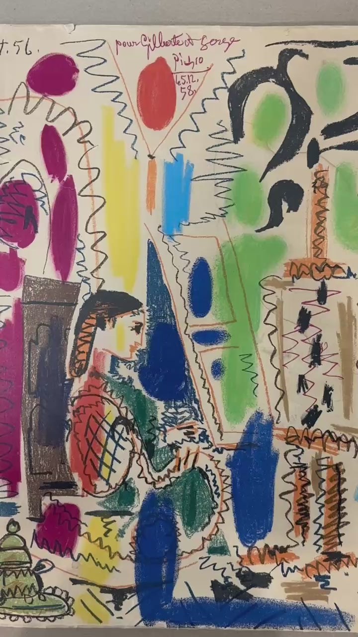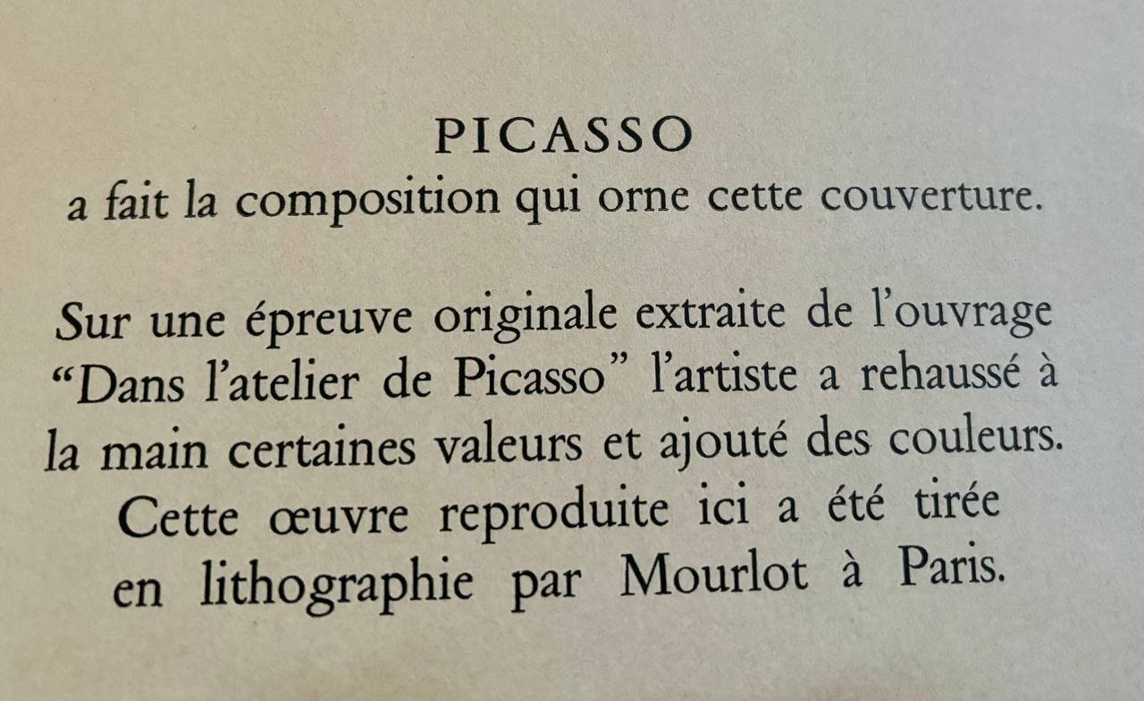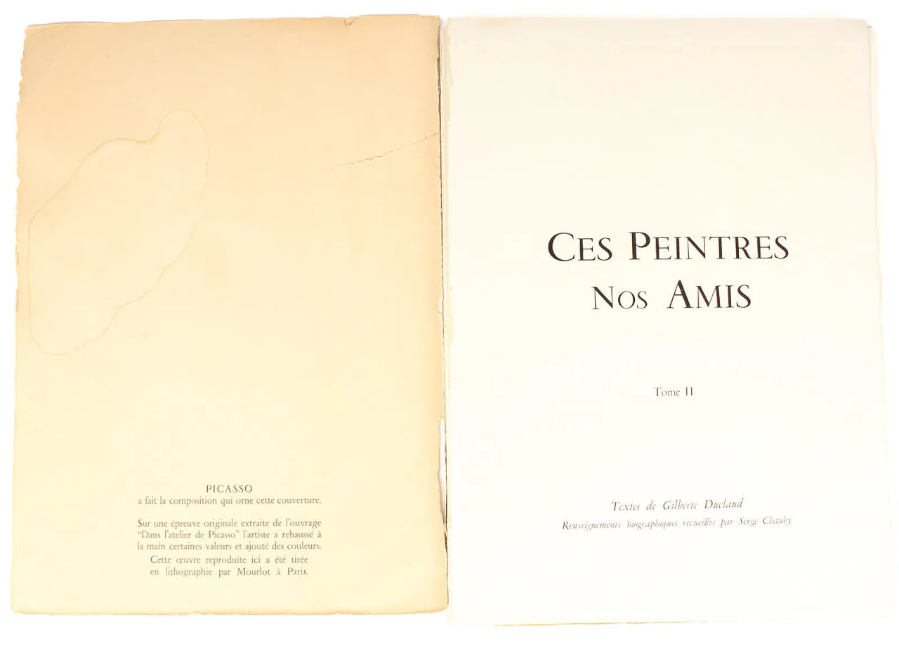 The work was first produced in 1956 as a frontispiece for the book Dans l'atelier de Picasso, Picasso later embellished the print with additional colours, for the cover of Ces peintres nos amis, Volume II.
