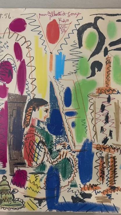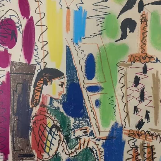 Lithograph in 18 colours, on Arches paper, the full sheet. From the plate signed edition of 250 first produced in 1956 as a frontispiece for the book Dans l'atelier de Picasso, this impression used as the cover of the volume Ces Peintres Nos Amis Vol. II, with the colours reworked by the artist, printed and published in 1960 by Mourlot, Paris, unframed.