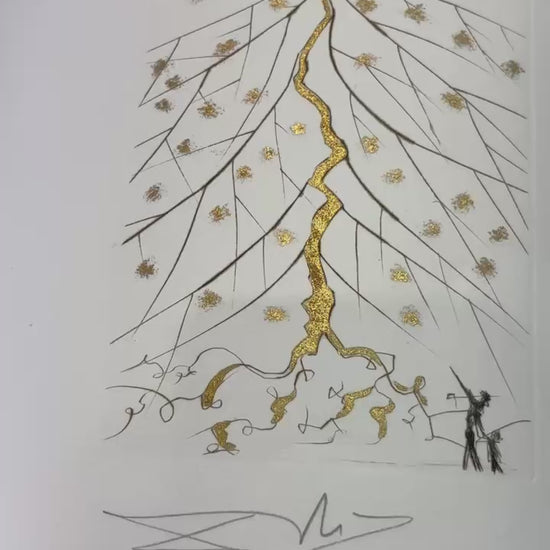 This rare and intimate work by Salvador Dalí exists exclusively in the form of a Christmas card, created in 1971. Star of Bethlehem depicts a tender scene: an adult and a child stand before a grand Christmas tree, illuminated by the radiant Star of Bethlehem above. The tree is highlighted with hand-applied gold, using the pochoir (stencil) technique, adding a warm and festive glow to the image.