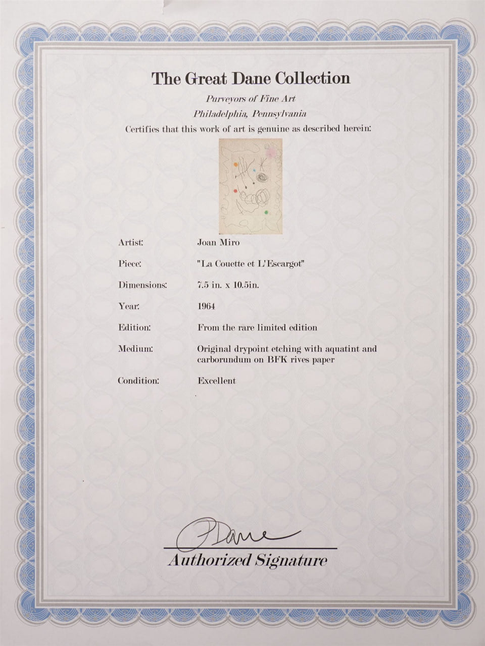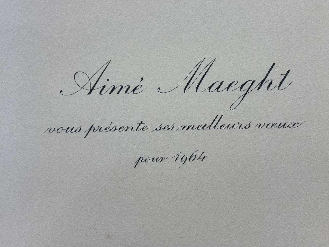 Issued folded, as intended, this piece bears the printed dedication “Aimé Maeght vous présente ses meilleurs vœux pour 1964…” ("Aimé Maeght sends you his best wishes for 1964") on the interior, with the verso inscribed “Pointe sèche originale de Joan Miró” (Original drypoint by Joan Miró).