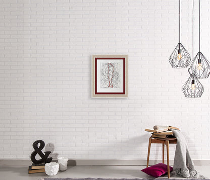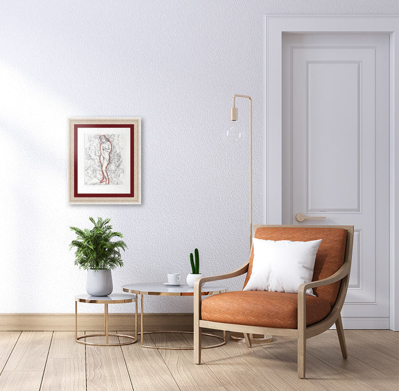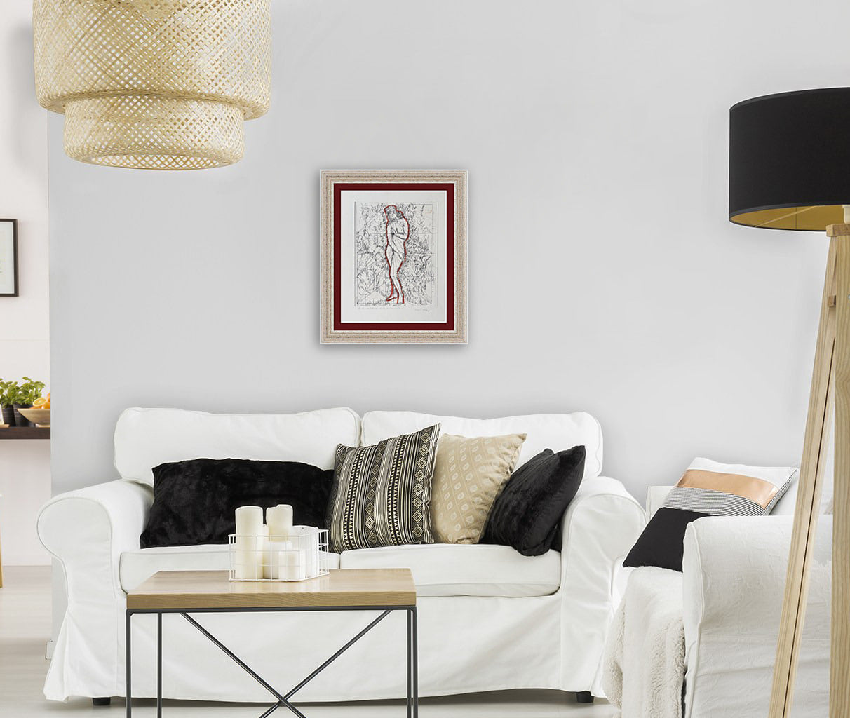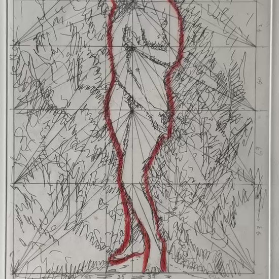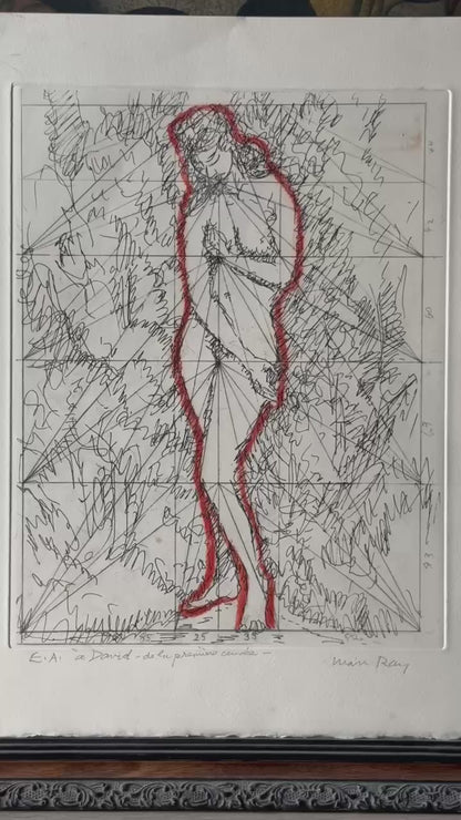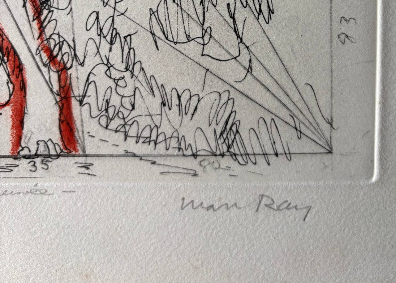 A delicate female figure stands at the center, her silhouette delicately hand-traced by the artist in red pastel, which boldly separates the body from the surrounding field of energetic black linear marks. This vivid intervention creates a powerful contrast between the fluidity of the form and the surrounding abstract space, evoking the tension between sensuality and structure — a hallmark of Surrealist expression. The red pastel line lends the figure a sense of immediacy and vibrancy, transforming the print into a singular, hand-embellished work of art.