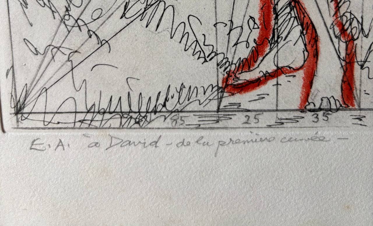 Original hand-signed etching with autograph dedication to David Beccaria: “à David de la première cuvée” (“To David from the first vintage”)